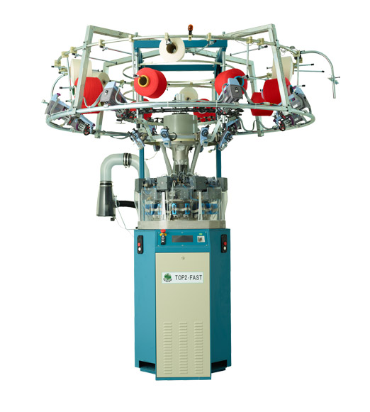 高效8路單面電子提花針織圓機,每路2個選針點,具三功位編織技術(shù)(配置16只選針器)。
